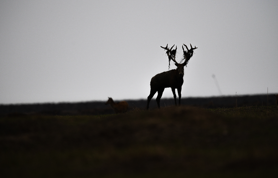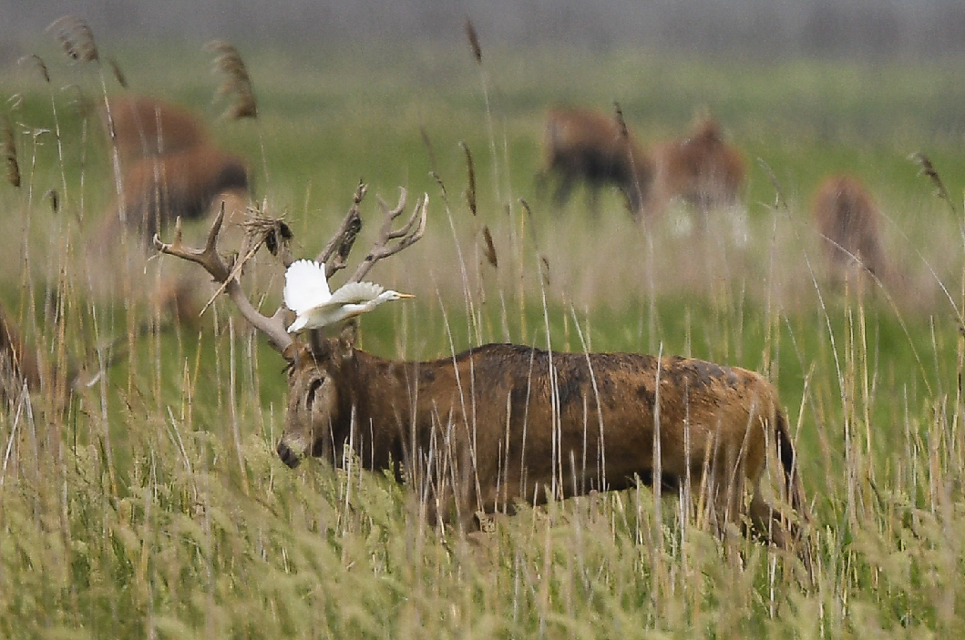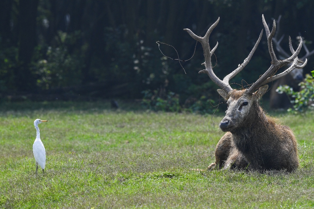 An egret flies past a milu deer in Dafeng Milu National Nature Reserve in east China's Jiangsu Province, June 27, 2019. (Xinhua/Li Xiang)