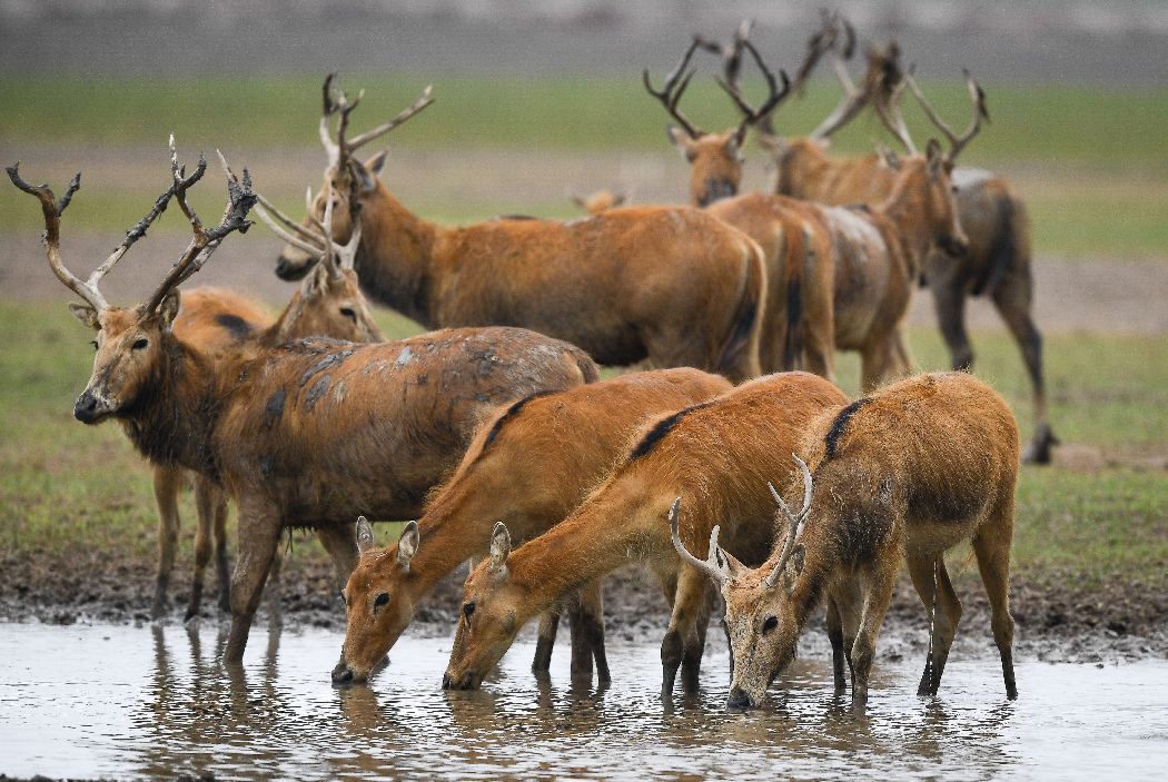 Milu deer drink water in Dafeng Milu National Nature Reserve in east China's Jiangsu Province, June 27, 2019. (Xinhua/Li Xiang)