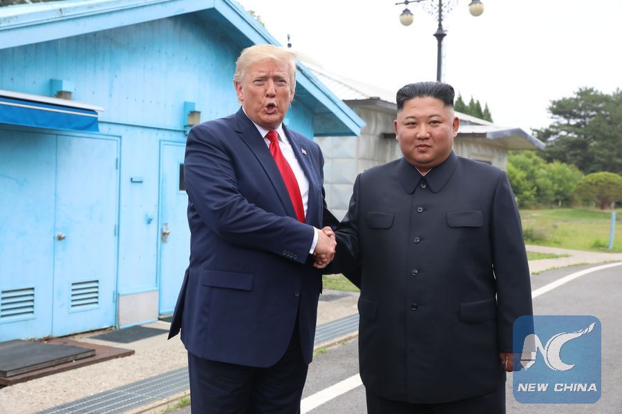U.S. President Donald Trump meets with Kim Jong Un, top leader of the Democratic People's Republic of Korea (DPRK), in the inter-Korean border village of Panmunjom on June 30, 2019. (Xinhua/NEWSIS)