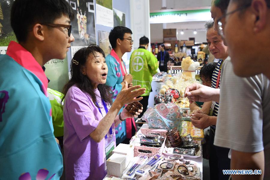 A Japanese exhibitor introduces goods to guests during the Lanzhou Investment & Trade Fair in Lanzhou, capital of northwest China's Gansu Province, July 4, 2019. The fair opened here on Thursday, and will last for five days. (Xinhua/Chen Bin)