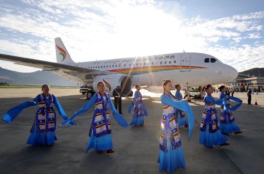 Performers give a dance performance beside a plane of the Tibet Airlines which prepares to take off at the Lhasa Gonggar Airport, southwest China's Tibet Autonomous Region, July 26, 2011. (Xinhua)