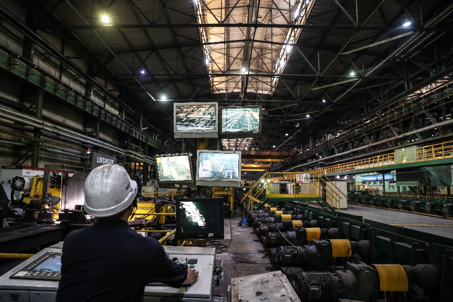 A worker supervises the production of steel rails at a plant of Ansteel Group Co., Ltd. in Anshan, northeast China's Liaoning Province, July 5, 2019. (Xinhua/Pan Yulong)