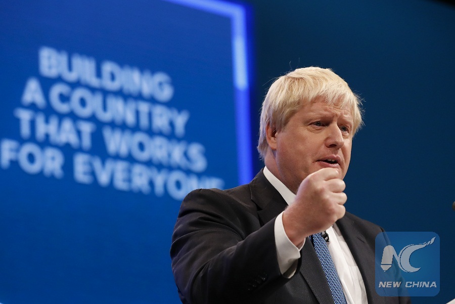 File photo taken on Oct. 3, 2017 shows then British Foreign Secretary Boris Johnson delivering his keynote speech during the Conservative Party Annual Conference 2017 in Manchester, Britain. (Xinhua/Han Yan)
