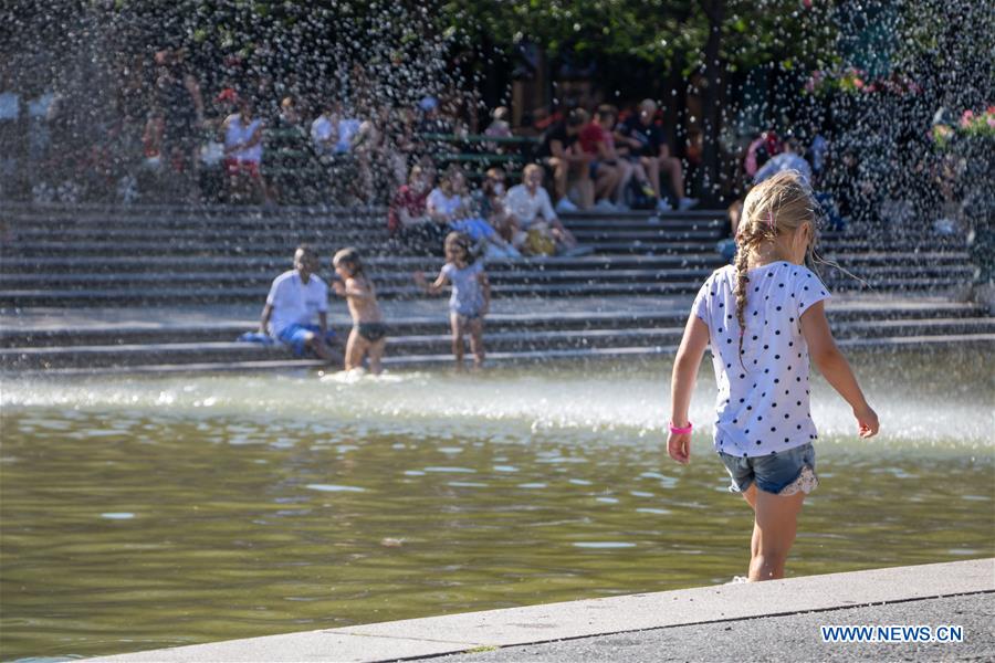 Kids play at a fountain in central Stockholm, capital of Sweden, July 27, 2019. In a new around of heat wave, the highest temperature reached 30 degrees Celcius in Stockholm on Saturday. (Photo by Wei Xuechao/Xinhua)
