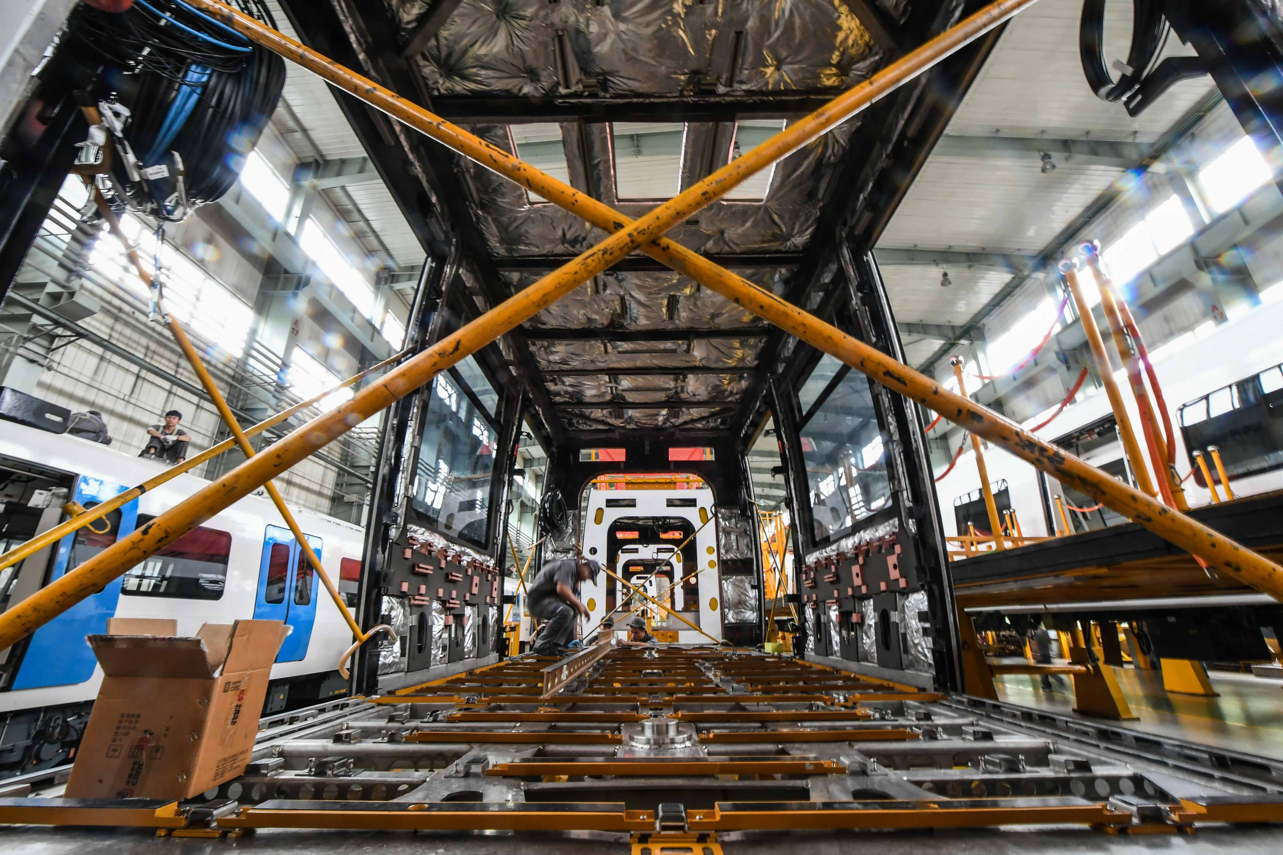 Workers connect wires for a carriage of an explosion-proof light rail train at a workshop of CRRC Changchun Railway Vehicles Co., Ltd. in Changchun, capital of northeast China's Jilin Province, July 25, 2019. (Xinhua/Wang Haofei)