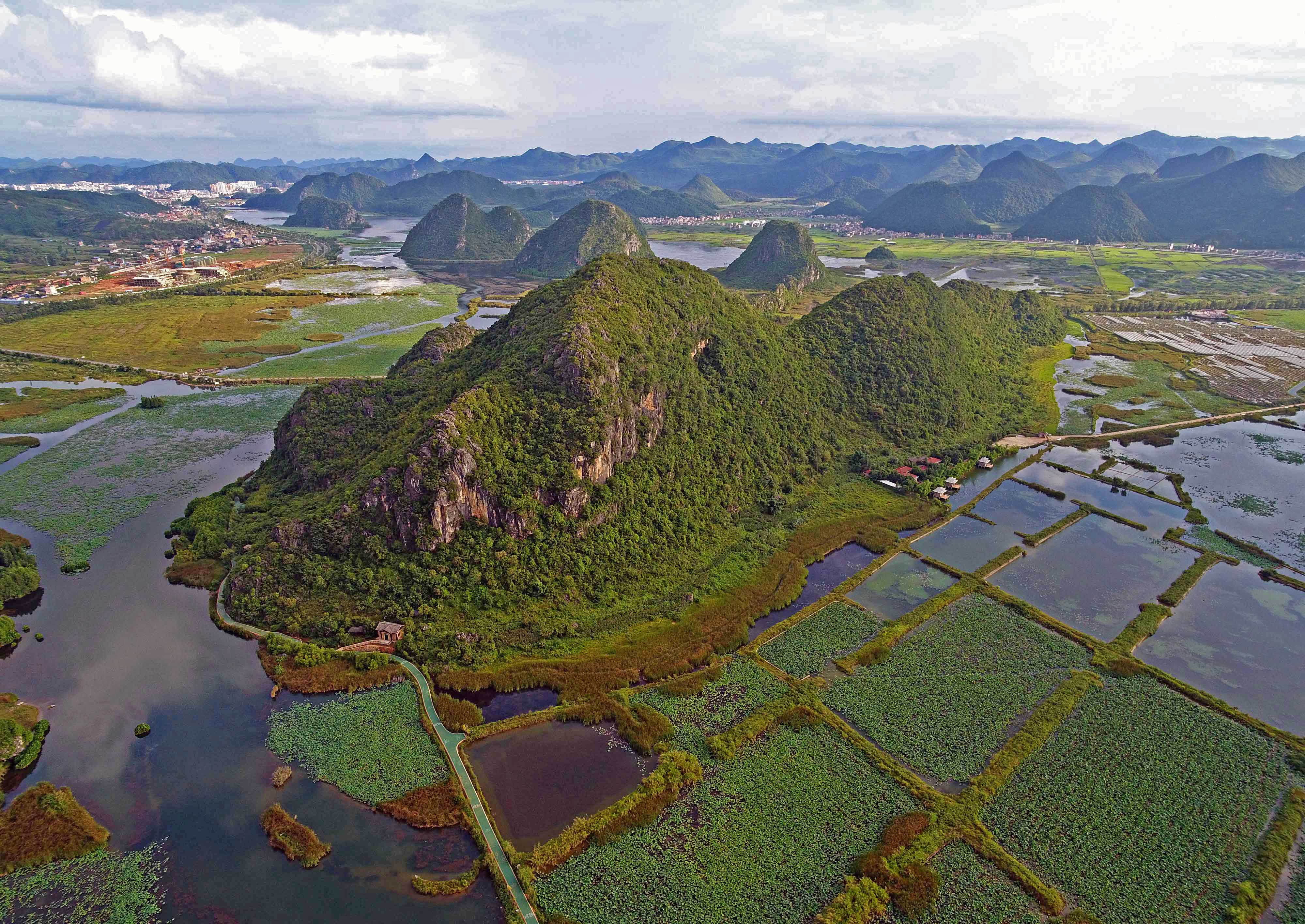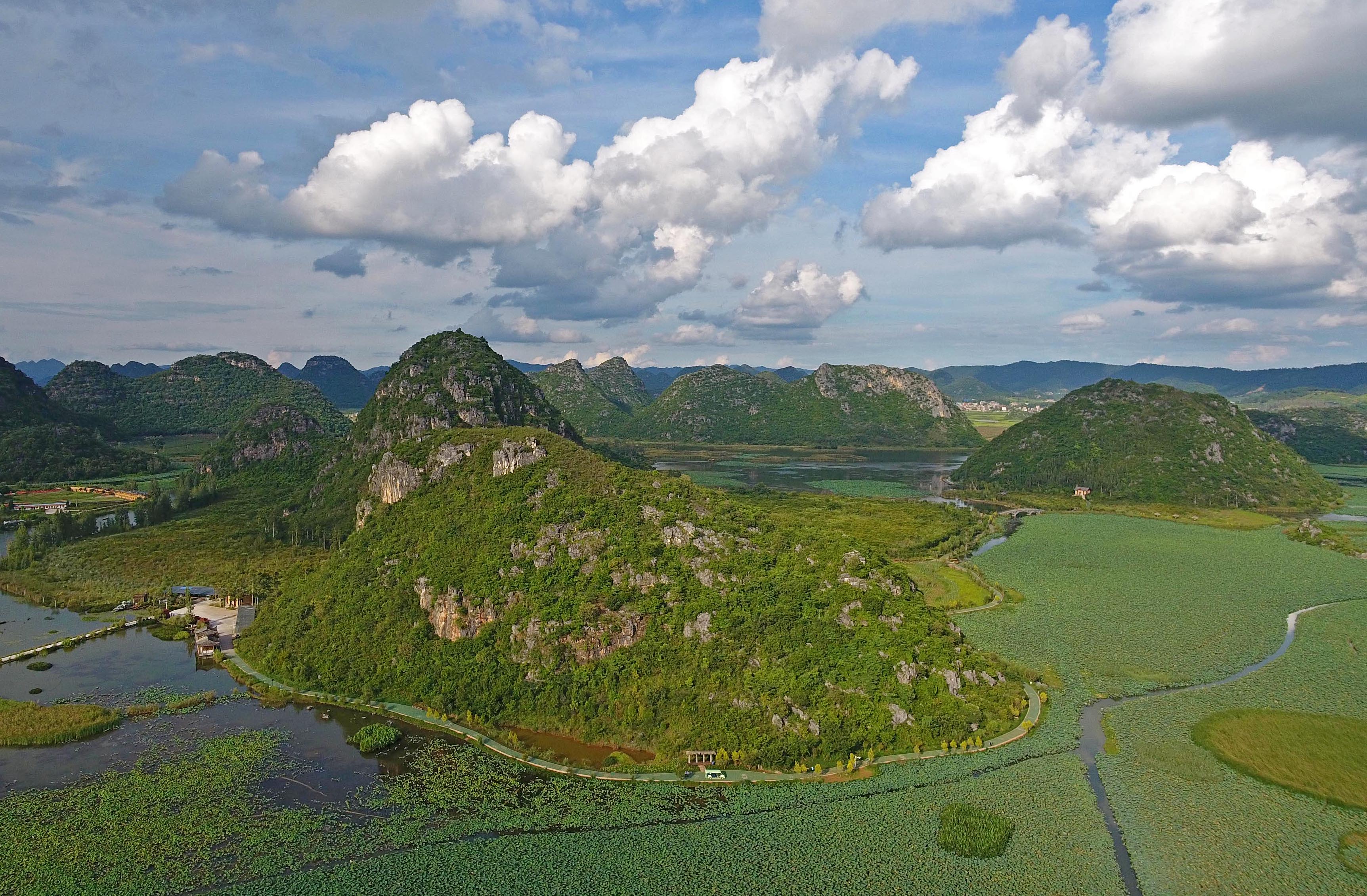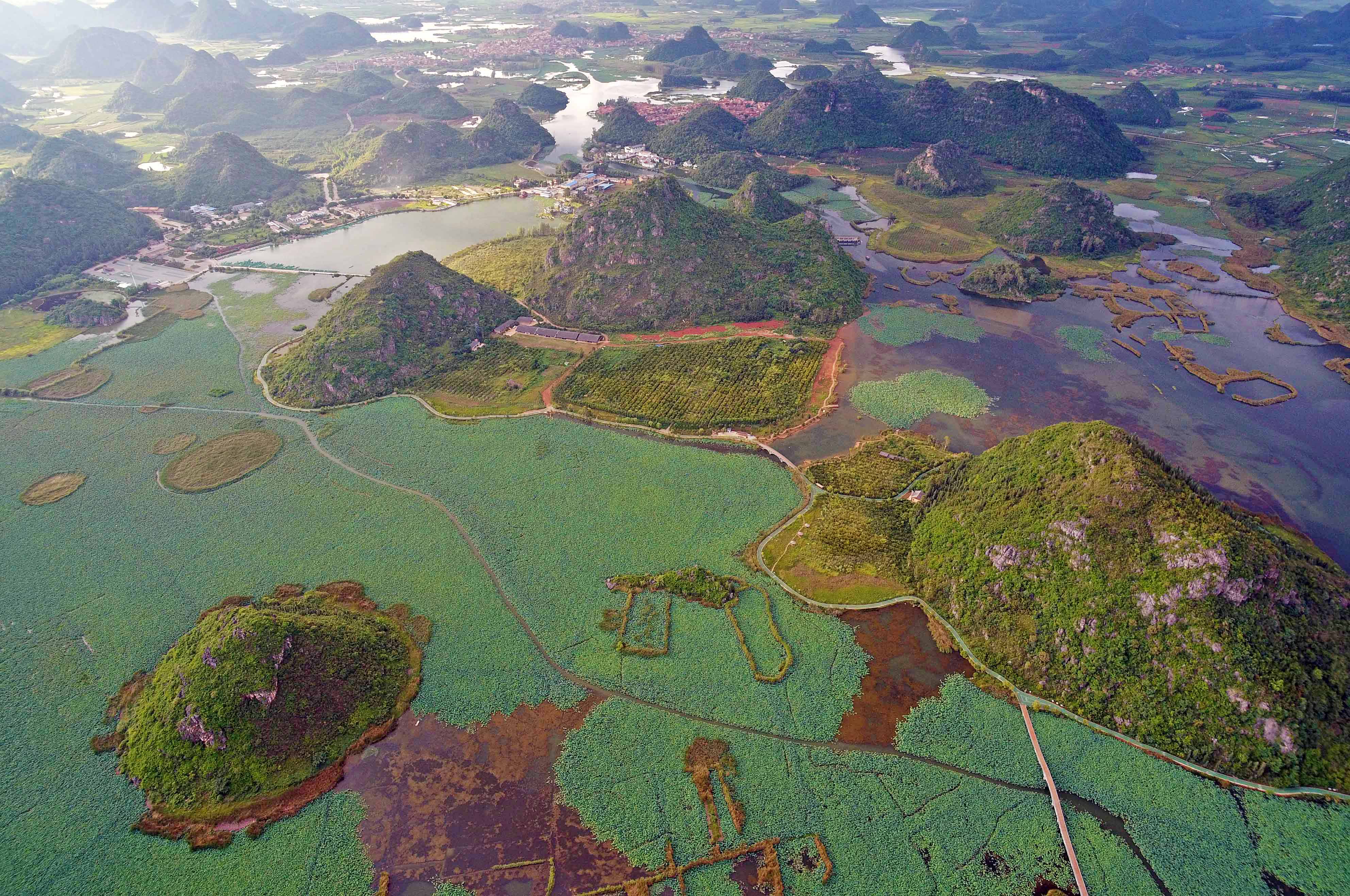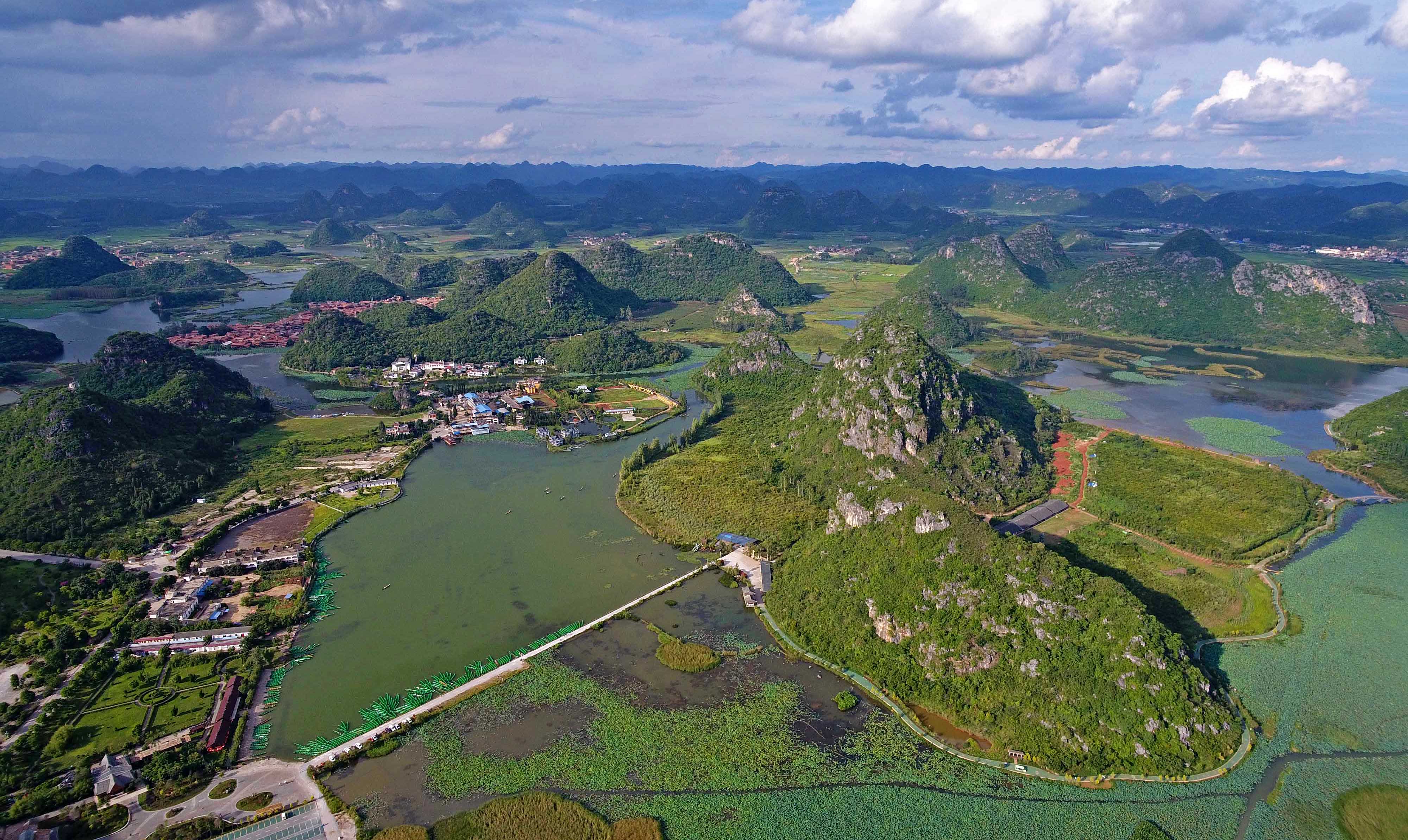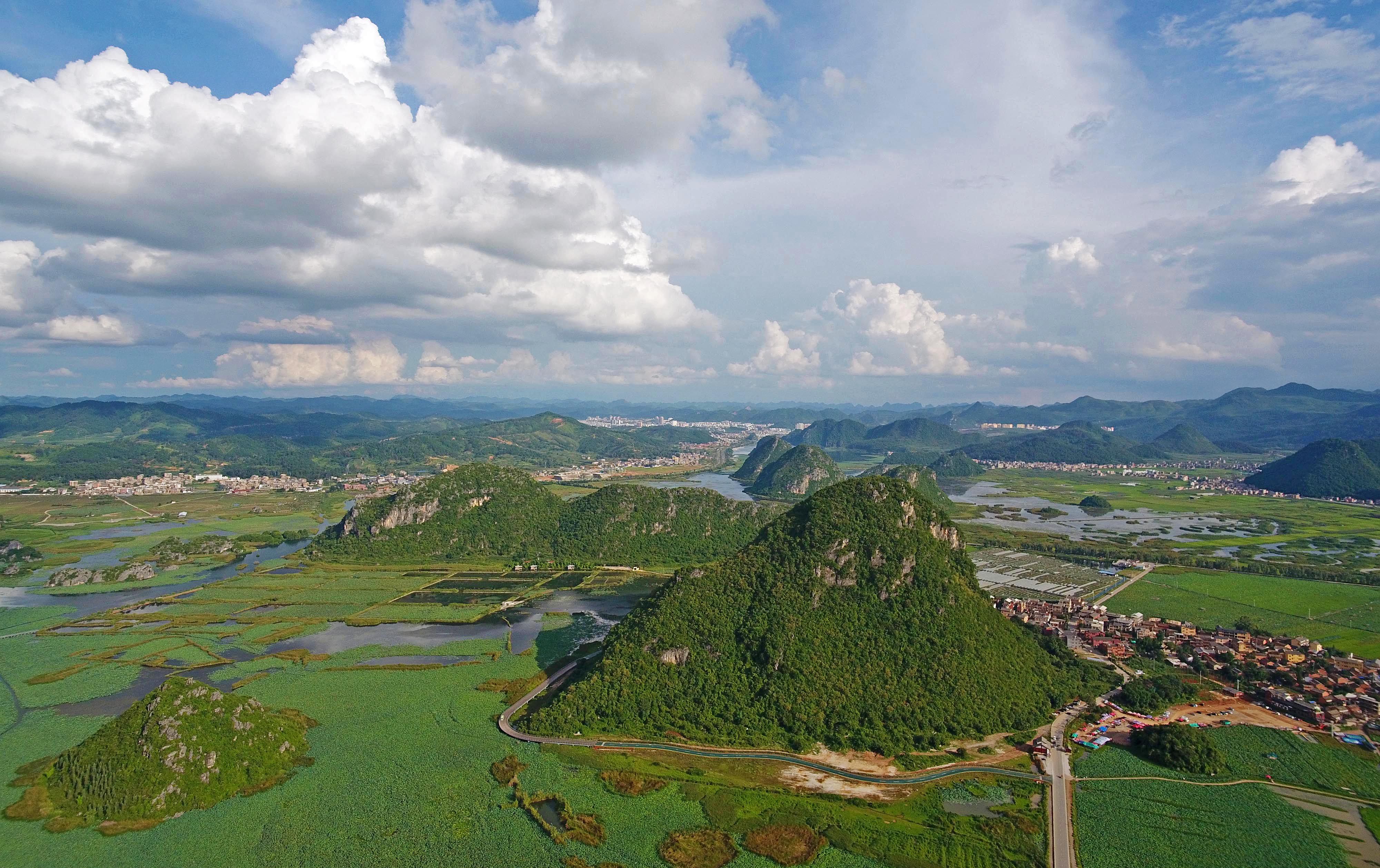 QIUBEI, Aug. 8, 2019 (Xinhua) -- Located some 3 km to the north of Qiubei County in southwest China's Yunnan Province, Puzhehei national wetland park was noted for its unique karst landscape and pastoral scenery.
