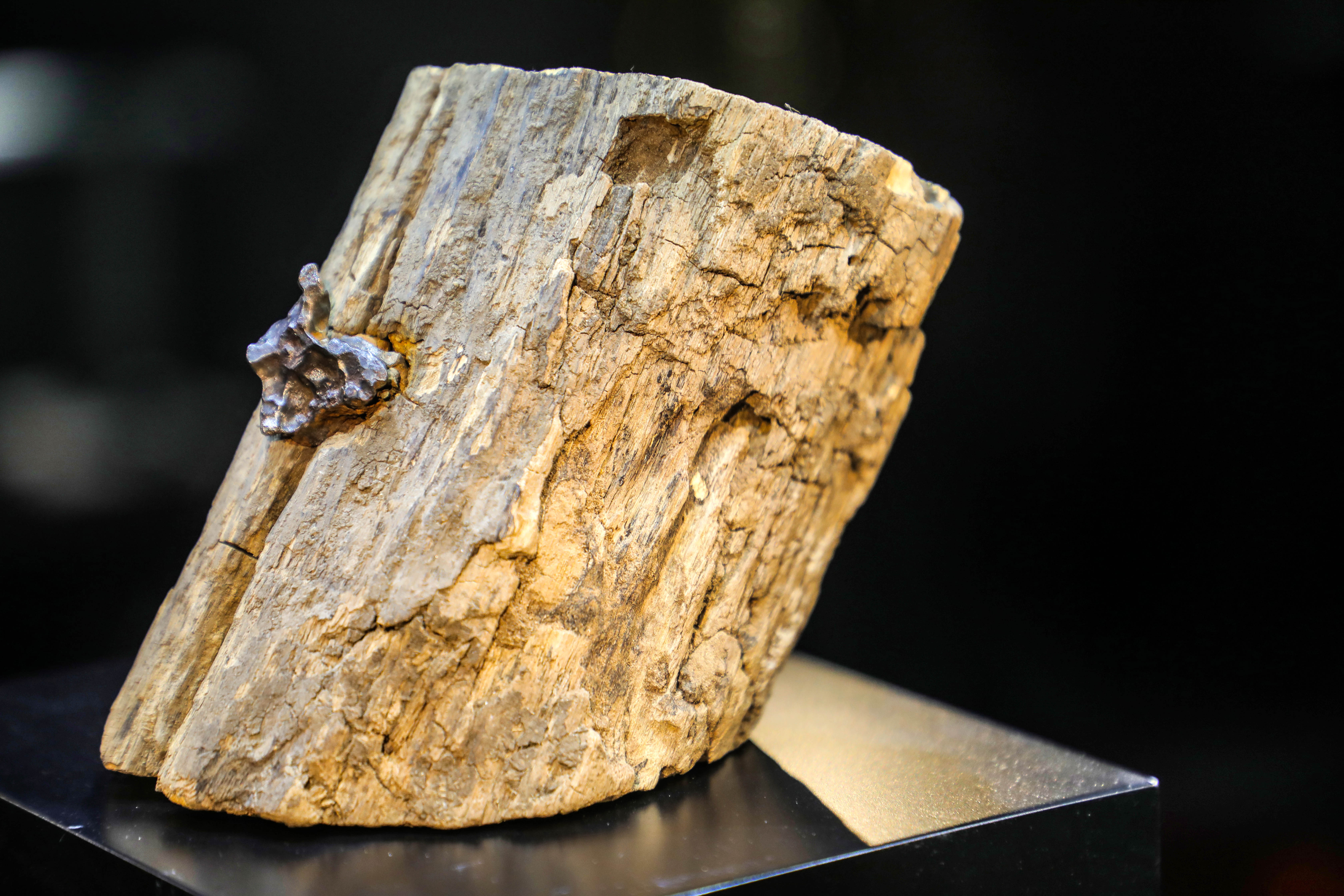 Photo taken on Aug. 9, 2019 shows a meteorolite from Russia, which is embedded in a petrified tree branch, on display at the Shanxi Museum of Geology in north China's Shanxi Province. (Xinhua/Wang Feihang)