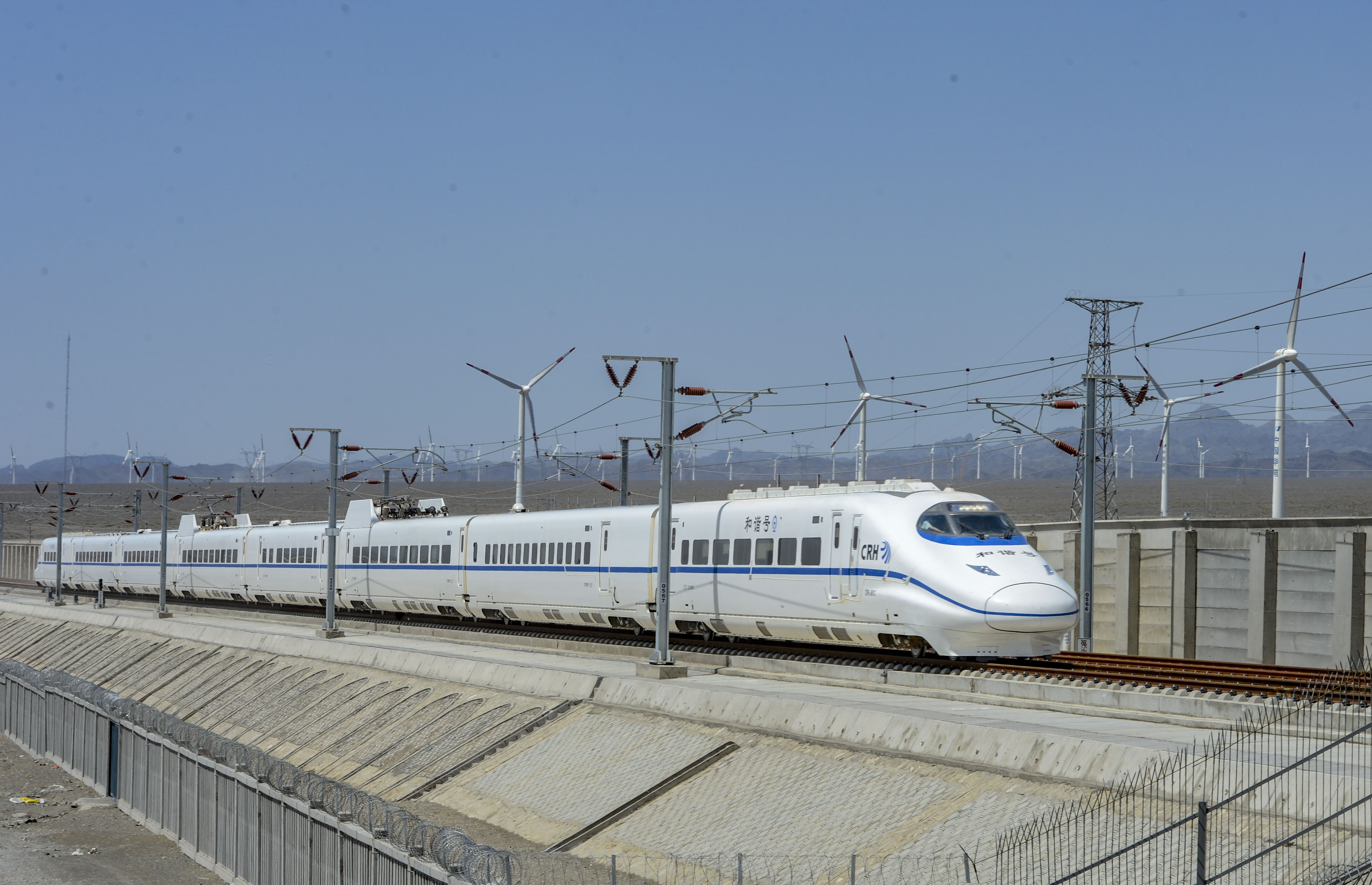 A bullet train runs past a wind power plant in Urumqi, northwest China's Xinjiang Uygur Autonomous Region. (Xinhua/Zhao Ge)