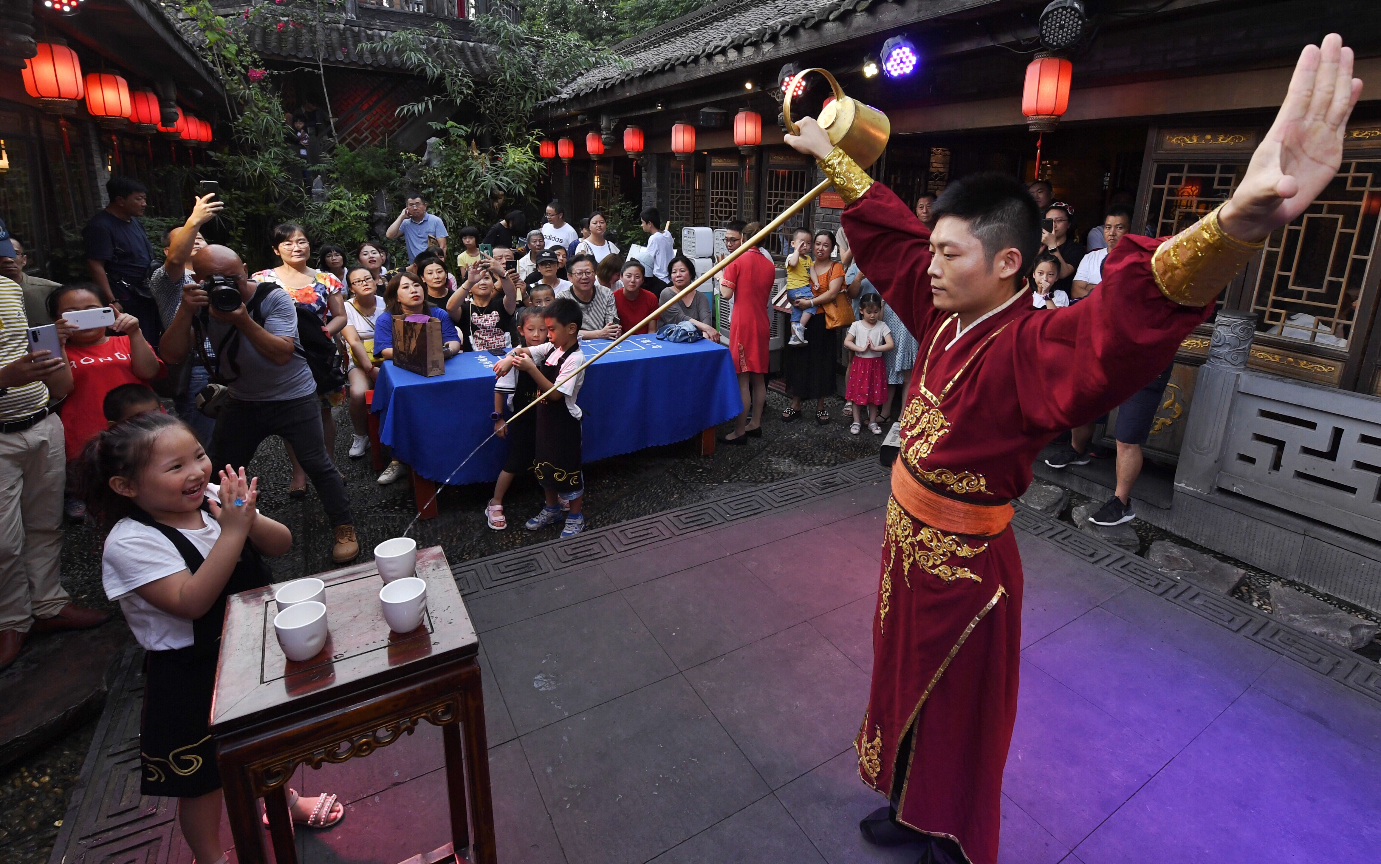 People watch a tea performance at the Kuanzhai Lane Historic District in Chengdu, capital of southwest China's Sichuan Province. (Xinhua/Liu Kun)