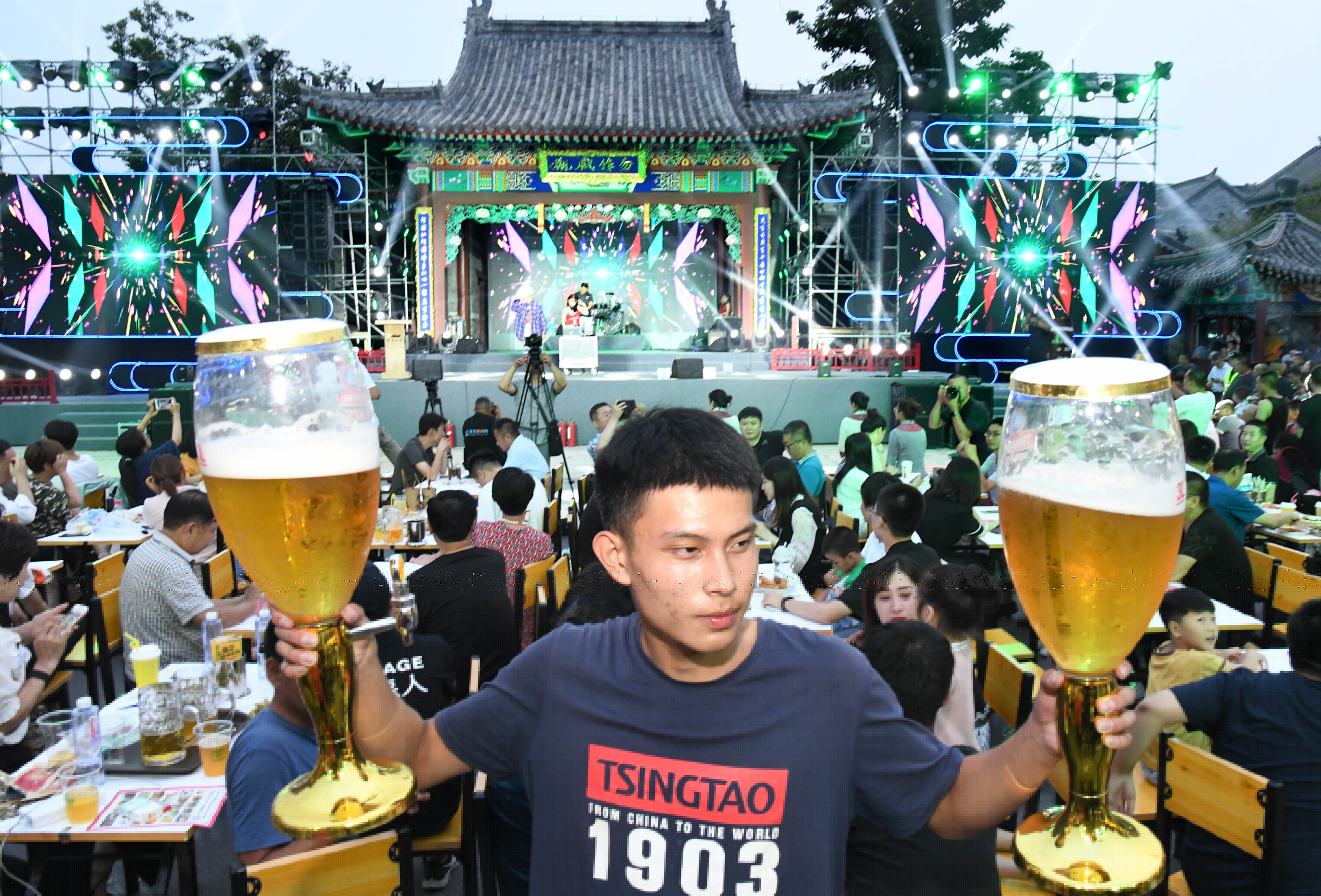 A man holds giant bottles of beer in the Qingdao International Beer Festival in Qingdao, east China's Shandong Province. (Xinhua/Li Ziheng)