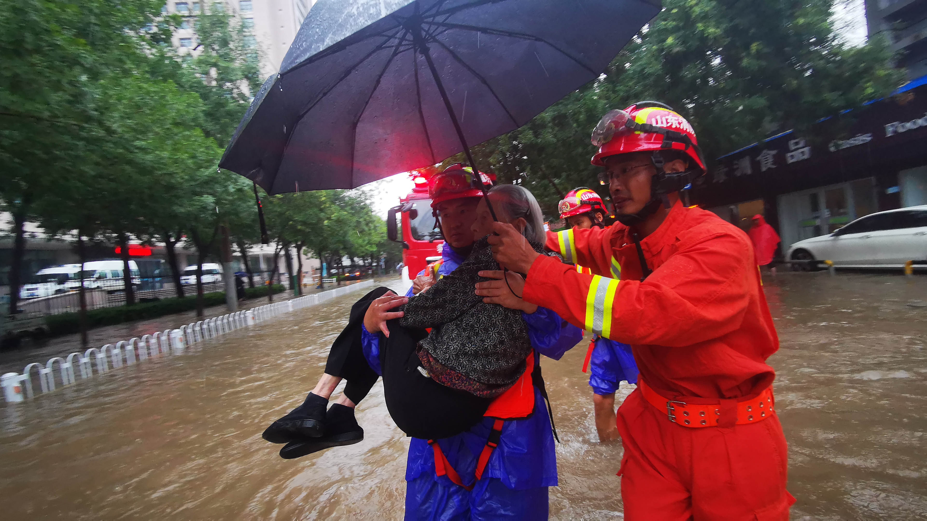 Rescuers help a flood-stranded elderly woman in Binzhou, east China's Shandong Province, Aug. 11, 2019. (Xinhua/Chen Pengyu)