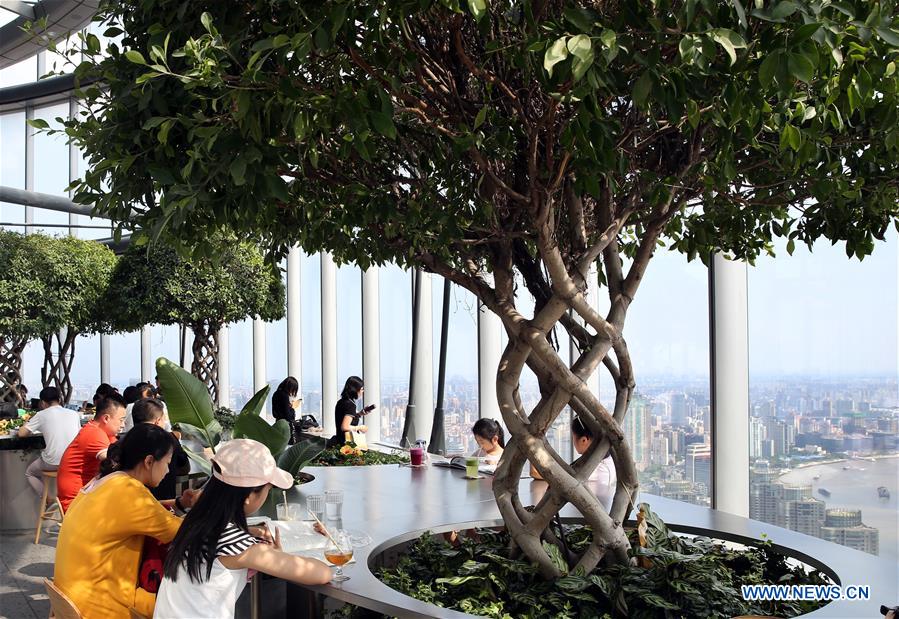 People read books at Duoyun Bookstore in Shanghai, east China, Aug. 12, 2019. Duoyun Bookstore in Shanghai officially opened to the public on Monday. Located at the 52nd floor of Shanghai Tower, Duoyun Bookstore offers readers and customers more than 60,000 books and a unique reading environment at a height of 239 meters. (Xinhua/Liu Ying)