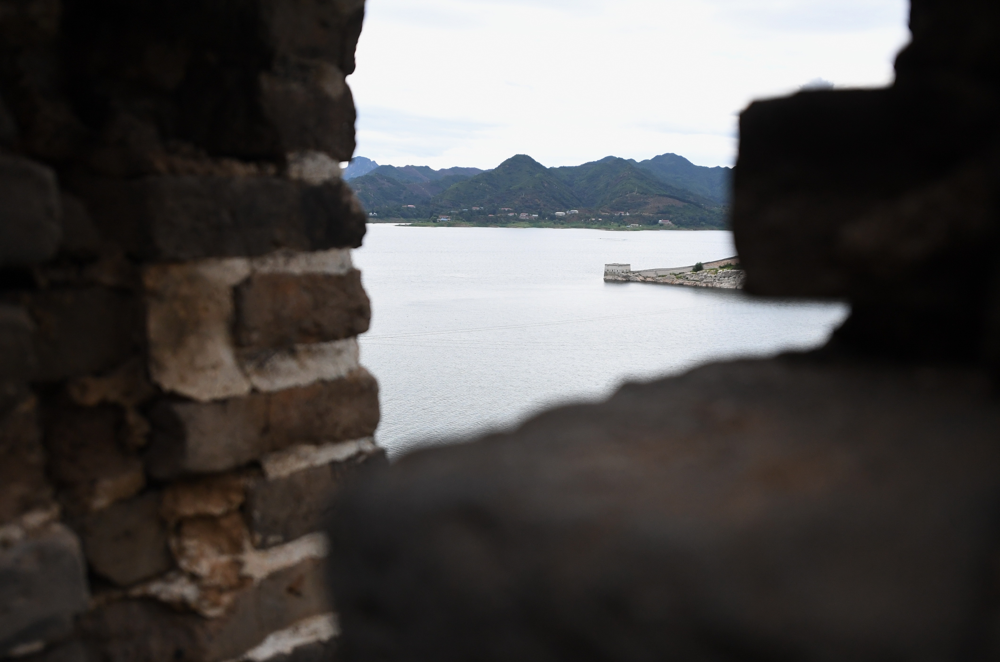Photo taken on Aug. 13, 2019 shows a section of the Great Wall in Panjiakou reservoir in north China's Hebei Province. (Xinhua/Zhu Xudong)