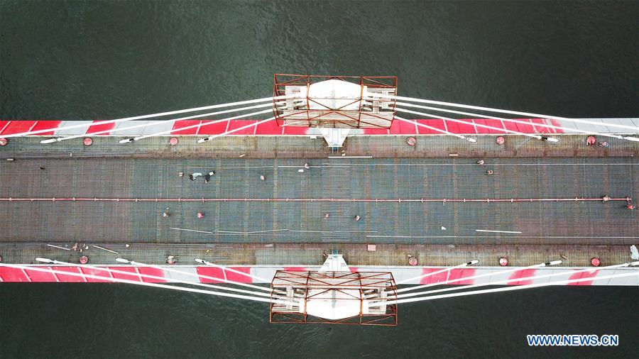 Aerial photo taken on Aug. 19, 2019 shows the construction site of the first highway bridge connecting China and Russia across the Heilongjiang River. Measuring 1,284 meters long and 14.5 meters wide, the bridge across the Heilongjiang River, known in Russia as the Amur River, stretches from Heihe, a border city in northeast China's Heilongjiang Province, to the Russian city of Blagoveshchensk. It is a key part of a 19.9 km-long highway project that links Jilin-Heilongjiang expressway in China and a highway in Blagoveshchensk. (Xinhua/Wang Jianwei)