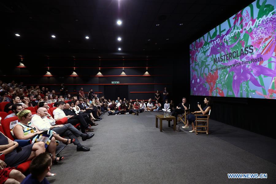 People attend an event with British actor Tim Roth during the Sarajevo Film Festival in Sarajevo, Bosnia and Herzegovina, on Aug. 20, 2019. Famous British actor Tim Roth on Tuesday received the Honorary Heart of Sarajevo award at the 25th Sarajevo Film Festival (SFF) for his exceptional contribution to the art of film. (Photo by Nedim Grabovica/Xinhua)