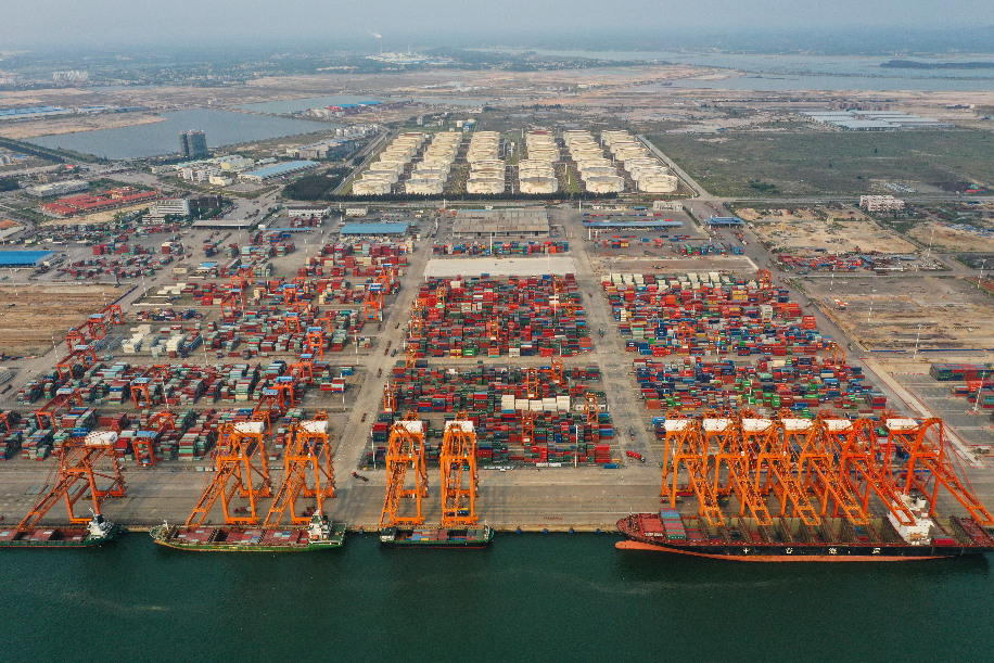 Aerial photo taken on April 11, 2019 shows a container wharf at Qinzhou port in south China's Guangxi Zhuang Autonomous Region. (Xinhua/Cao Yiming)