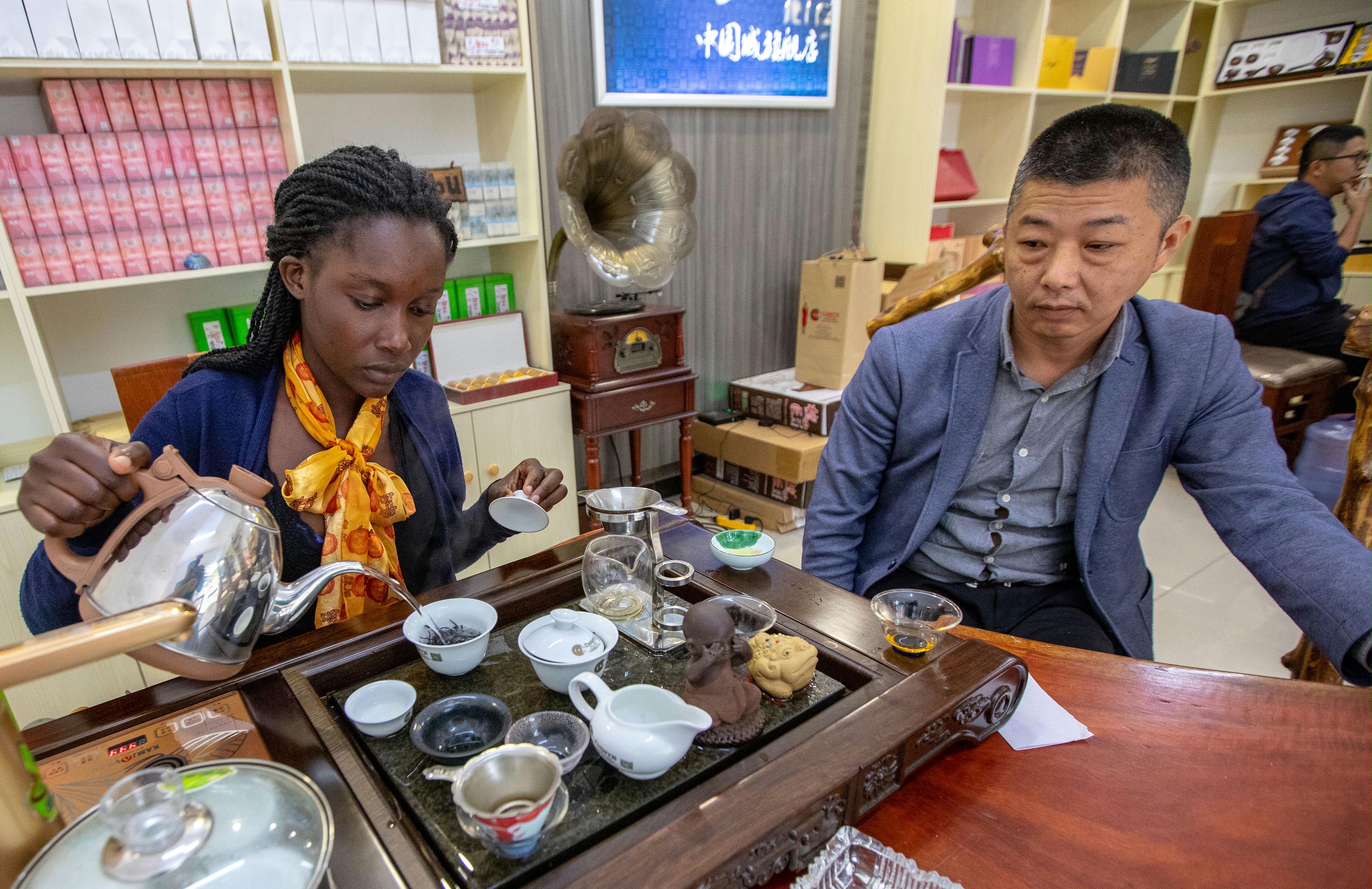 A Kenyan employee makes tea for a customer at a shop of Chinya Tea Development Co., LTD in Nairobi, Kenya, Aug. 11, 2018. (Xinhua/Zhang Yu)