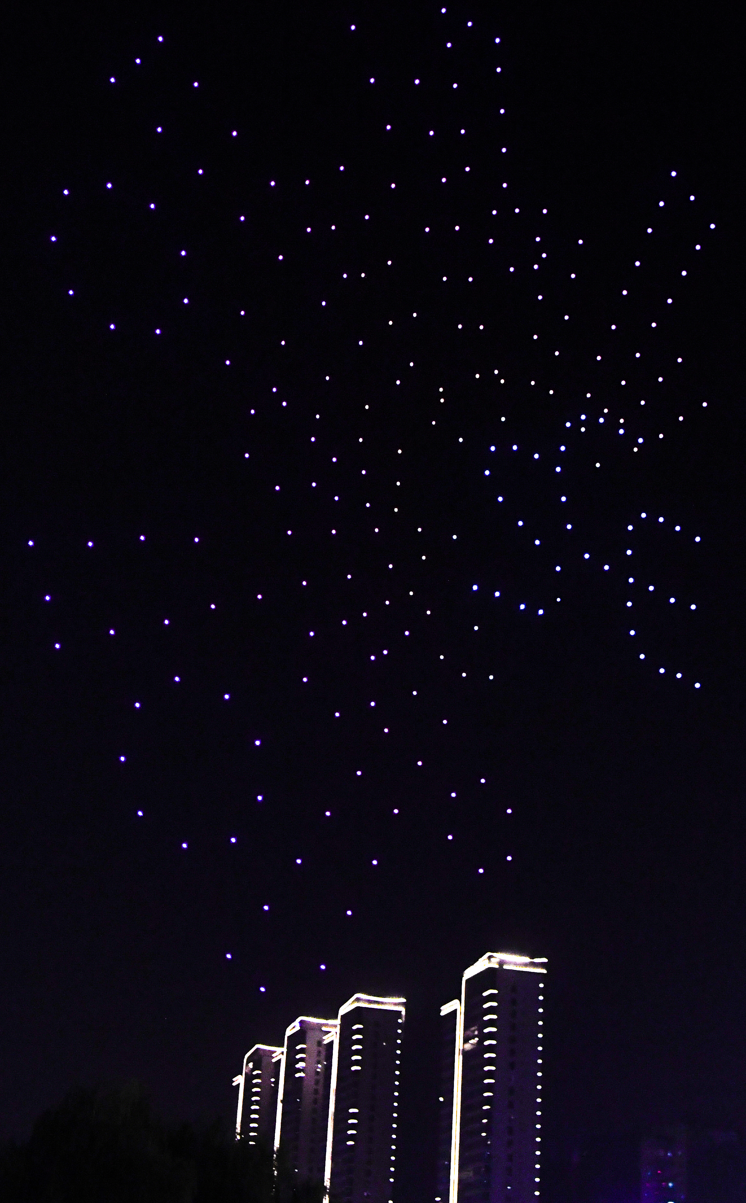 Drones make up the logo of the 2019 Smart China Expo during a drone light display in southwest China's Chongqing, Aug. 26, 2019. (Xinhua/Wang Quanchao)