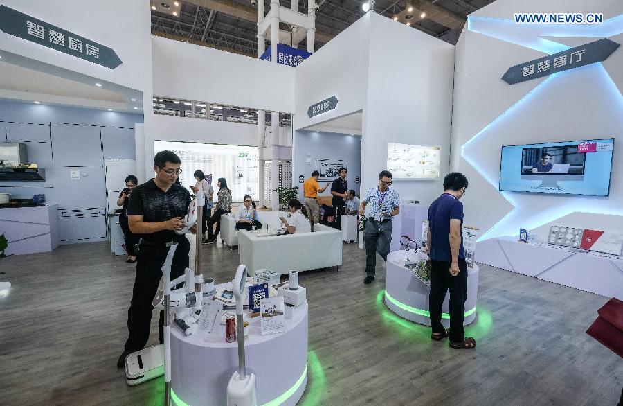 People learn about smart home appliances on display at the 9th China Smart City and Intelligent Economy Expo in Ningbo, east China's Zhejiang Province, Sept. 6, 2019. Unveiled here on Friday, the 9th China Smart City and Intelligent Economy Expo showcases latest products and technologies in the area. (Xinhua/Xu Yu)