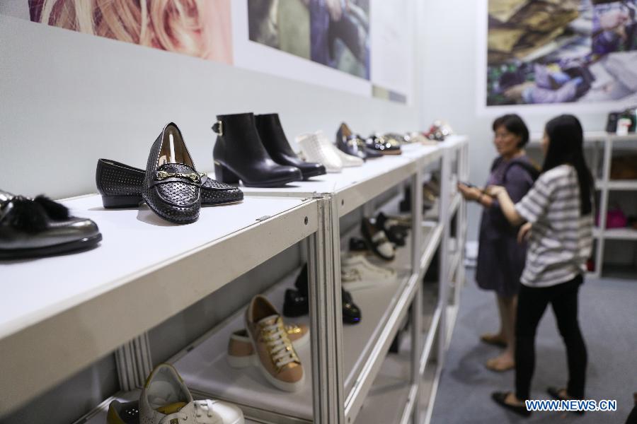 People view footwears displayed during the 30th China (Dalian) International Garment and Textile Fair in Dalian, northeast China's Liaoning Province, Sept. 7, 2019. The fair started in Dalian on Saturday. (Xinhua/Long Lei)