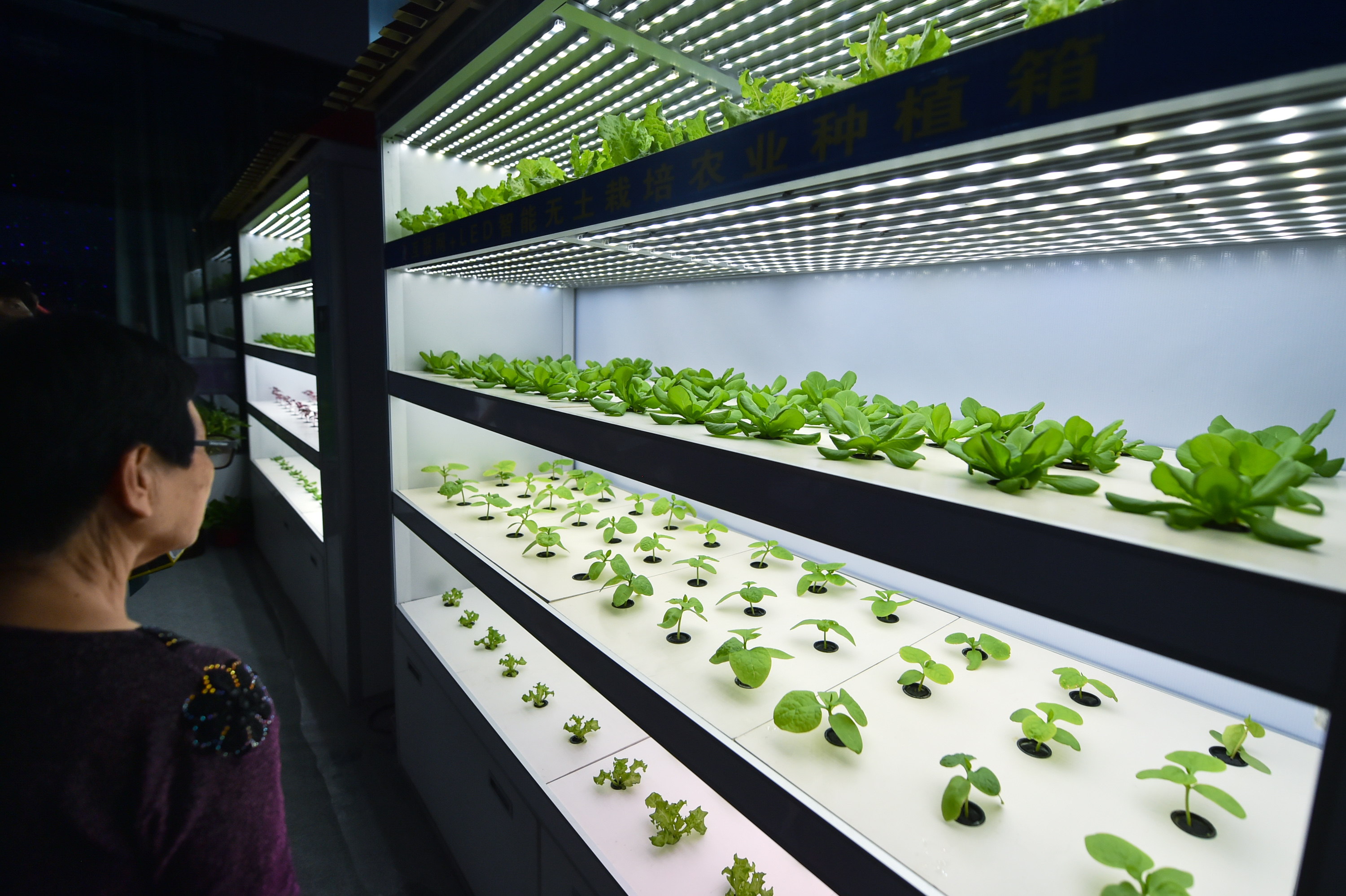 A visitor looks at an LED agricultural grow box displayed at the Expo, Sept. 6, 2019. (Xinhua/Li Mangmang)
