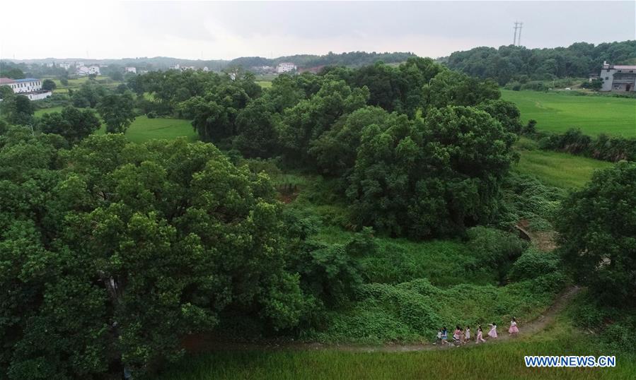 Aerial photo taken on Sept. 2, 2019 shows Tu Youyou escorting children back home after school at Caojia Village in Luoting Township, Wanli District of Nanchang City, east China's Jiangxi Province. After graduating from normal education major in 2013, Tu worked as an assistant in a training institution and did community work, but she always dreamed of being a teacher. In 2016, she passed the teacher recruitment examination of Jiangxi Province and became a rural teacher. In the past three years, Tu Youyou has won the recognition of her students' parents. Now, the 29-year-old rural teacher is the principal of Shangban primary school. In the school, most of students are left-behind children. Tu Youyou found that many of them were interested in music, dance, painting and sports. To enrich children's life, she invited voluntary teachers in 2018 to set up various courses, including dance, piano, taekwondo and tennis, and studied piano on her own for teaching. Students call her "sister principal" and are willing to share their stories with her. (Xinhua/Peng Zhaozhi)