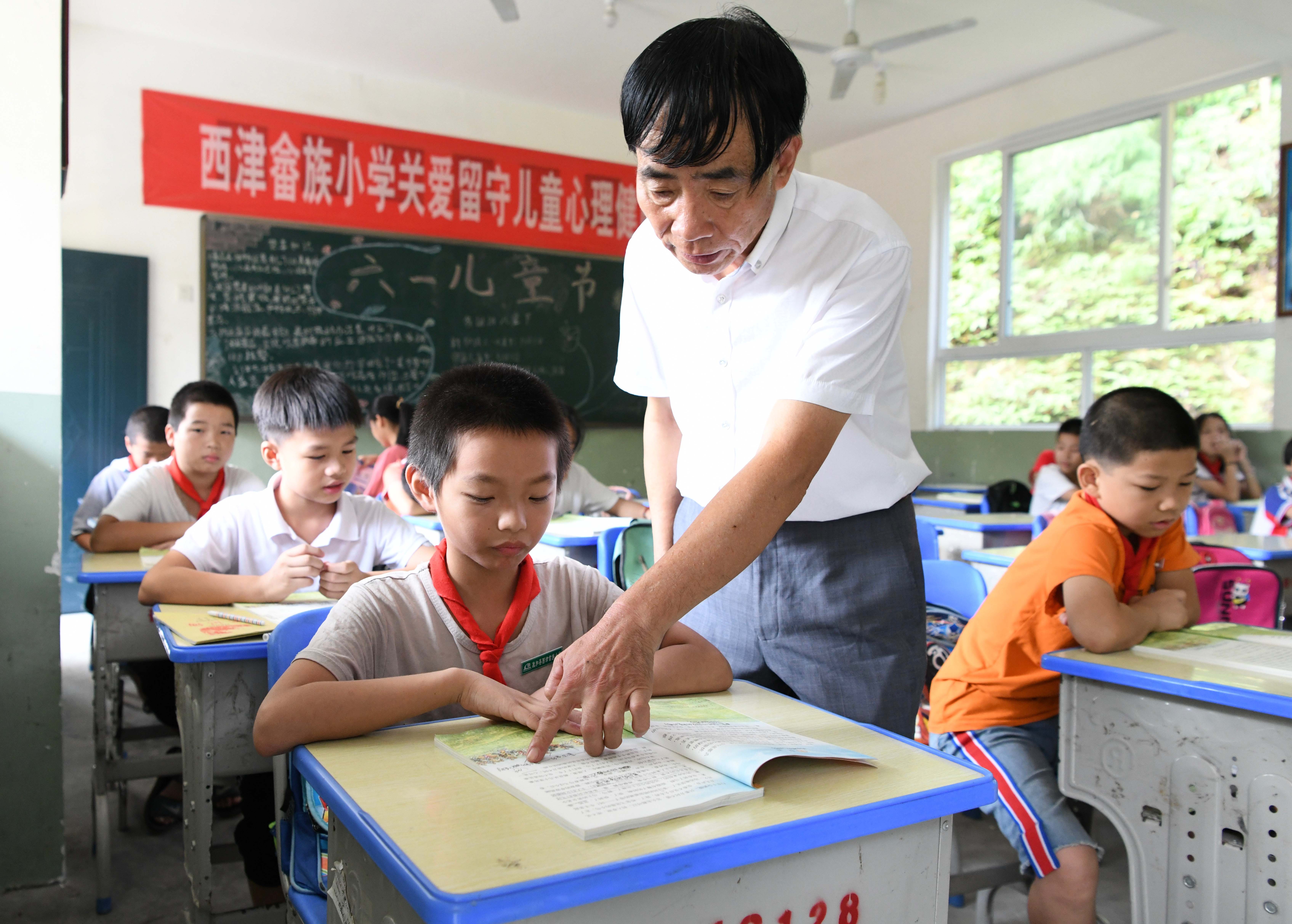 Zhuang Guigan helps a student with her school work at the Xijin She ethnic group primary school, Sept. 3, 2019. (Xinhua/Lin Shanchuan)