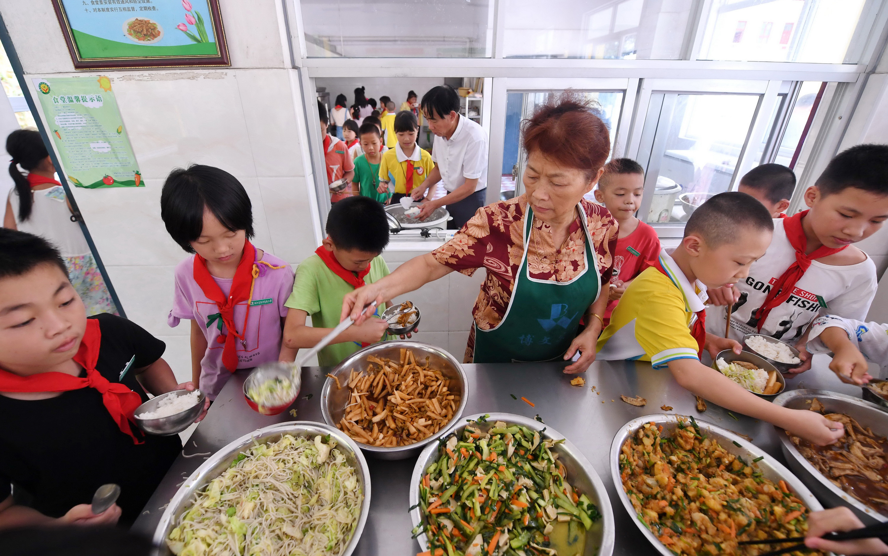 Zhuang Guigan and his wife Liang Chun'ai serve a dish for children at the Xijin She ethnic group primary school, Sept. 4, 2019. (Xinhua/Lin Shanchuan)