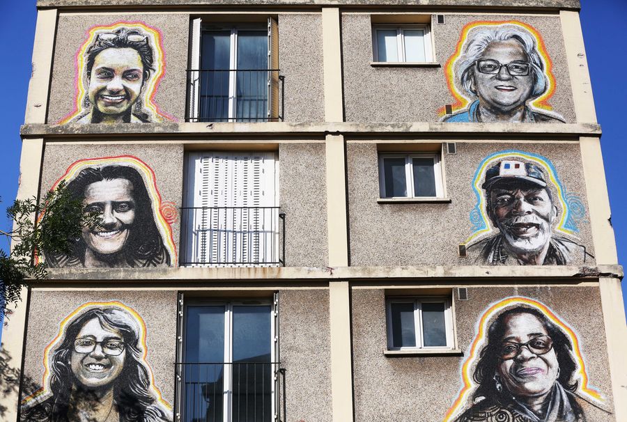 People pass by a building with mural paintings in Paris, France, Sept. 3, 2019. (Xinhua/Gao Jing)
