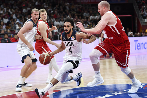 Derrick White (2nd R) breaks through during the Classification Games 7-8 between the United States and Poland at the 2019 FIBA World Cup in Beijing, capital of China, on Sept. 14, 2019. (Xinhua/Ju Huanzong)
