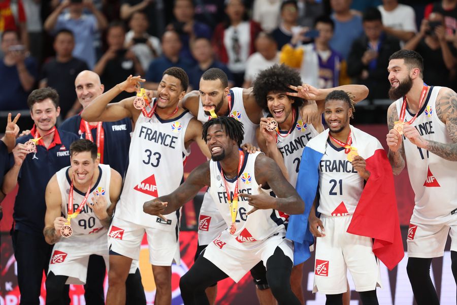 Players of France celebrate during the awarding ceremony after the third place game between France and Australia at the 2019 FIBA World Cup in Beijing, capital of China, Sept. 15, 2019. (Xinhua/Meng Yongmin)