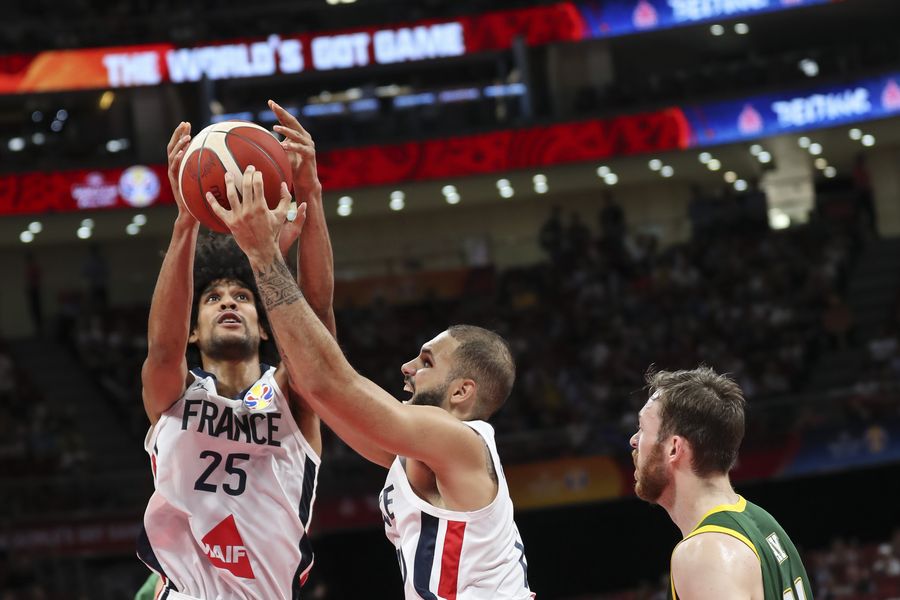 Louis Labeyrie (L) and Evan Fournier (C) of France compete during the third place game between France and Australia at the 2019 FIBA World Cup in Beijing, capital of China, Sept. 15, 2019. (Xinhua/Meng Yongmin)