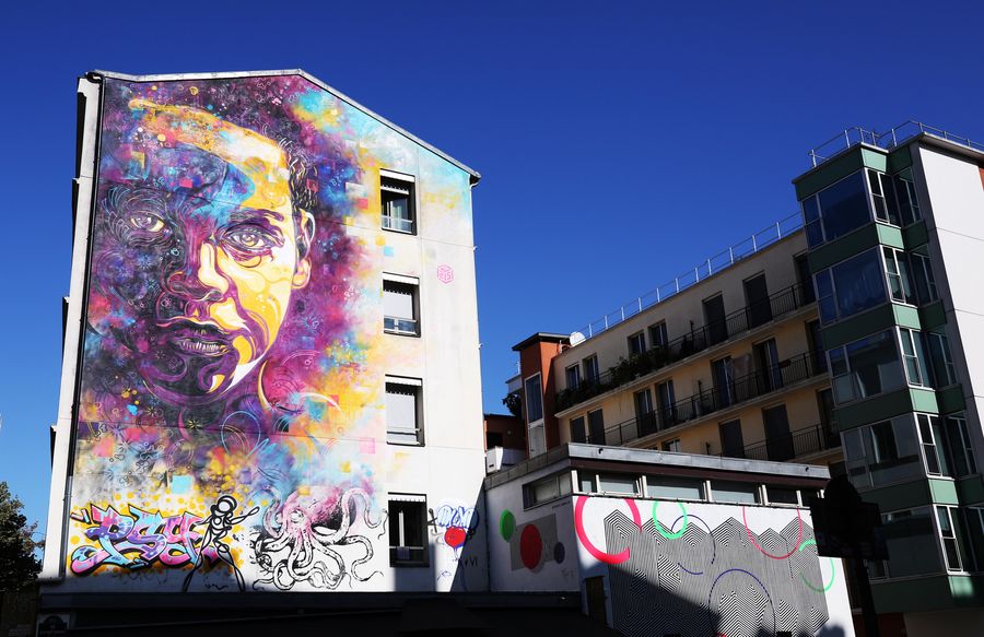 PARIS, Sept. 17 (Xinhua) -- Checking out the spectacular murals in the 13th district of Paris, where artists have painted the exterior walls of buildings, bringing striking street art to the French capital.