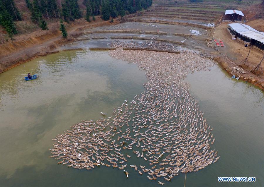 Aerial photo taken on March 17, 2018 shows a shelduck breeding base at Duhuai Village of Guangshan County in Xinyang, central China's Henan Province. In recent years, Xinyang has been taking advantage of local resources to pursue a path of green development. (Xinhua/Feng Dapeng)