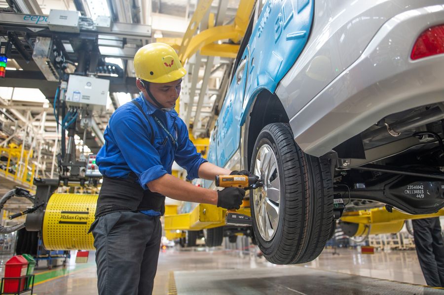 A worker assembles a vehicle at the assembly line of the SAIC-GM-Wuling Automobile (SGMW) plant in Cikarang, Indonesia, March 14, 2019. (Xinhua/Du Yu)