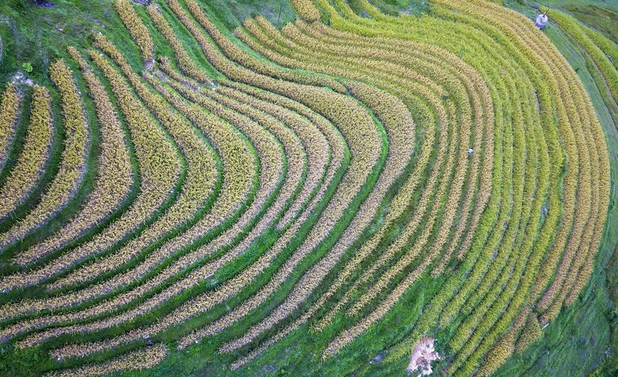 Aerial photo taken on Sept. 17, 2019 shows a view of the terraced fields at Jihua Village in Rongjiang County of Qiandongnan Miao and Dong Autonomous Prefecture, southwest China's Guizhou Province. (Xinhua/Yang Wenbin)