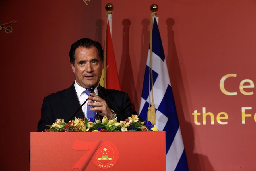 Adonis Georgiadis, Greek Minister of Development and Investments, delivers a speech at a reception hosted by the Chinese embassy in Athens, Greece, Sept. 23, 2019.(Xinhua/Marios Lolos)