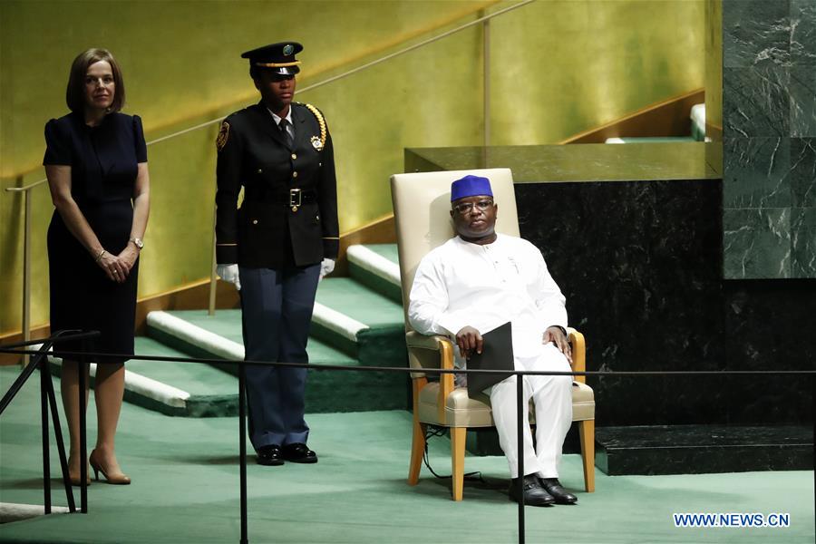 Sierra Leone's president Julius Maada Bio (R) waits to address the General Debate of the 74th session of the UN General Assembly at the UN headquarters in New York, on Sept. 26, 2019. (Xinhua/Li Muzi)