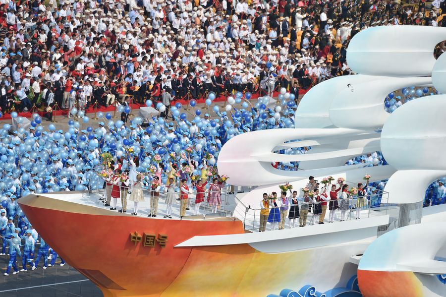 A float formation takes part in a mass pageantry celebrating the 70th anniversary of the founding of the People's Republic of China (PRC) in Beijing, capital of China, Oct. 1, 2019. (Xinhua/Wang Jianwei)