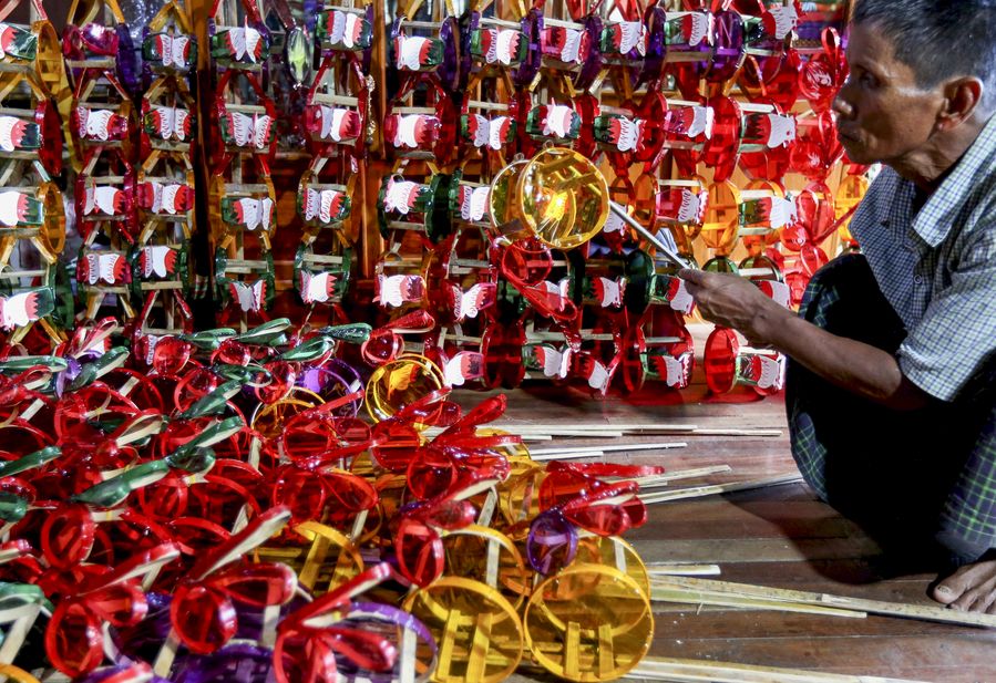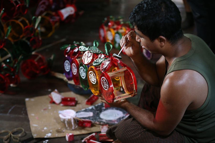 A worker arranges toy lanterns at a workshop in Yangon, Myanmar, Oct. 3, 2019. (Photo by U Aung/Xinhua)