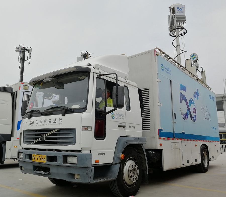 On-site support personnel are interconnecting with the command center through satellite, 5G and 4G data transmission at the National Exhibition and Convention Center (Shanghai) ahead of the second China International Import Expo (CIIE) in east China's Shanghai, Oct. 9, 2019. (Xinhua/He Xiyue)