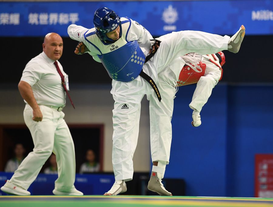 Kim Hyeongwoo (C) of the Republic of Korea competes with Dylan Chellamootoo of France during the men's -63kg final of taekwondo at the 7th CISM Military World Games in Wuhan, capital of central China's Hubei Province, Oct. 25, 2019. (Xinhua/Wang Jianwei)