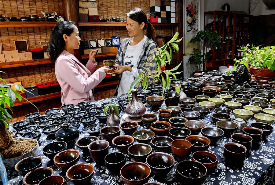 A visitor chooses Jianzhan teawares during the expo, Oct. 25, 2019. (Xinhua/Zhang Guojun)