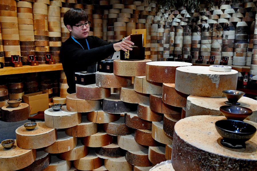 An exhibitor arranges Jianzhan teawares during the expo, Oct. 26, 2019. (Xinhua/Zhang Guojun)