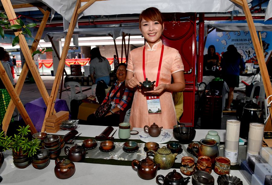 An exhibitor from southeast China's Taiwan displays teawares during the expo, Oct. 26, 2019. (Xinhua/Zhang Guojun)