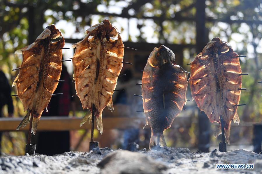 People roast fish at Dolan scenic spot of Awat County, northwest China's Xinjiang Uygur Autonomous Region, Oct. 26, 2019. (Xinhua/Sadat)