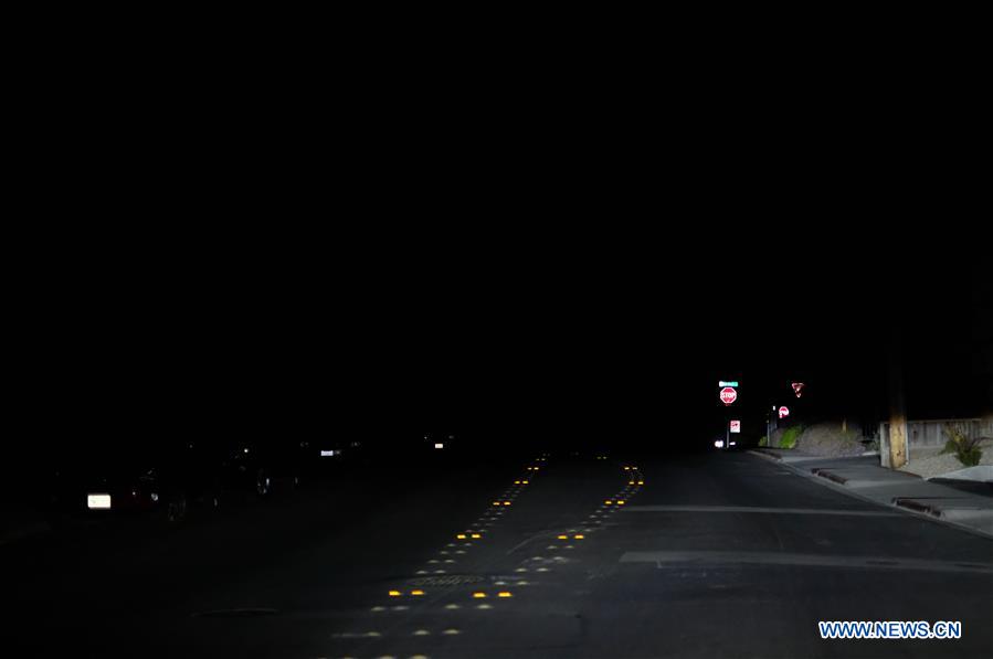 Photo taken on Oct. 28, 2019 shows a residential area during a blackout in Redwood City, the San Francisco Bay Area, California, the United States. The Pacific Gas and Electric Company (PG&E), a main electricity power supplier in California, conducted a round of Public Safety Power Shutoff from Saturday, which impacted a total of 940,000 customers in 36 counties across the state. The company said it is a measure designed to reduce the threat of wildfires that could be sparked by lines brought down in gusting winds. (Xinhua/Wu Xiaoling)