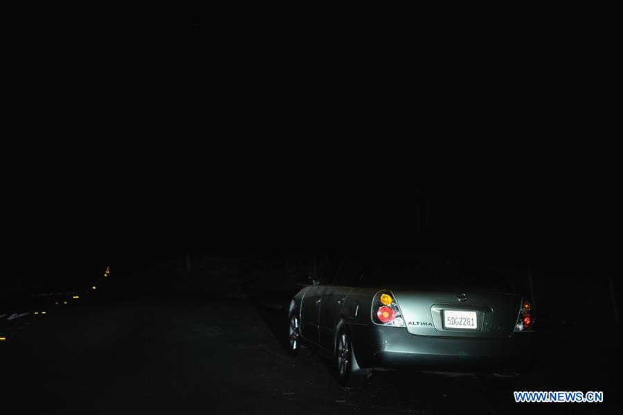 Photo taken on Oct. 28, 2019 shows a residential area during a blackout in Redwood City, the San Francisco Bay Area, California, the United States. The Pacific Gas and Electric Company (PG&E), a main electricity power supplier in California, conducted a round of Public Safety Power Shutoff from Saturday, which impacted a total of 940,000 customers in 36 counties across the state. The company said it is a measure designed to reduce the threat of wildfires that could be sparked by lines brought down in gusting winds. (Xinhua/Wu Xiaoling)