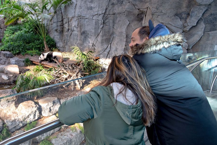 Visitors view a panda at the Calgary Zoo, Canada, Oct. 30, 2019. (Photo by Andrew Soong/Xinhua)