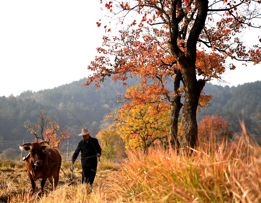 A farmer ploughs in the field with an ox at the foot of Dabieshan Mountain, Nov. 3, 2019. (Photo by Hao Yuan/Xinhua)